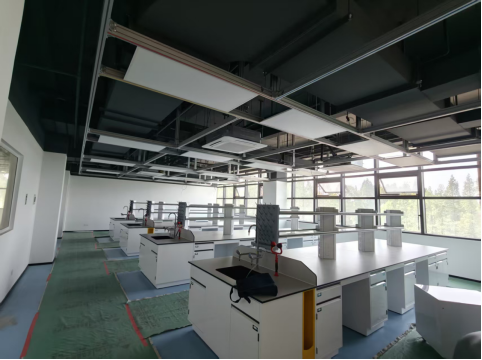 二零二五年五月。①公寓楼区域部分:四栋宿舍楼分体空调开始安装;②教学实验区部分:2#主实训楼课桌椅开始安装;3#临床实验实训楼完成一层走道地砖铺贴,完成楼梯间踢脚线安装,完成四、五层卫生间隔断,实验室区域一层开水管沟,二到五层风管墙面破除,五层照明管线完成50%,给排水完成60%;4#基础实验实训楼完成楼梯间踢脚线安装,实验室区域二、三层总风管安装完成,二、三层给排水管安装完成,四、五层实验室内照明、动力穿线完成90%;5#医工结合楼完成二层教学机房静电地板安装,中庭楼梯进行铝板包封,实验室区域二、三层照明线管完成100%,二至四层风管墙面破除,一层管沟破除均完成;6#产教研发楼完成一层房间、走道地砖铺贴,进行一层电梯厅干挂砖施工,实验室区域二至五层轻钢龙骨隔墙制作完成90%,墙面封板完成50%,一至五层给水主管道打压全部完成,支管完成90%,排水支管完成90%,排气管全部完成,二至五层洁净墙板进场80%,安装完成20%;16#医学研究用房完成楼梯间踢脚线安装,完成卫生间水池台面安装,实验室区域二层墙板完成95%,顶板完成90%,一层墙板进场,一层墙体定位放线完成,二层内圆弧完成90%,一层主风管安装20%,二层下排风管安装80%,三层风管支管安装30%;③行政后勤区域部分:7#综合楼进行北侧楼梯铝板安装,完成七层会议室吸音板安装,进行卫生间台盆、隔断安装;8#体育健身馆比赛馆区域进行地坪浇筑,走廊顶面进行铝板安装;9#创新创业中心完成二、三层房间墙面,一层房间进行吊顶施工,600人报告厅进行舞台施工;10#后勤用房内装施工进入收尾;15#国际交流中心完成地下室风机盘管灌水试压,完成主楼1层风机盘管接驳,完成裙楼1层风机盘管灌水试压。