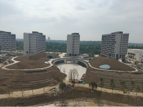 二零二四年一月。工人生活区板房安装已完成;现场办公区的餐厅垫层、板房、围墙基础安装已完成;北侧道路和南侧道路浇铸已完成;河道临时道路施工的80%已完成;管桩进场验收完成31533米(占总桩长的40%),现场桩基开始施工。施工深化设计部分,桩基图审、基坑支护设计初稿、五大专业图纸已完成。为加快工程进度,项目施工单位春节期间照常施工,重点推进教职员工公寓、学生公寓楼A、学生公寓楼B、学生公寓楼C 以及综合信息服务楼、产教研发楼桩基施工的桩基施工。